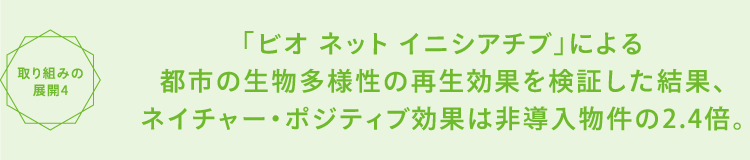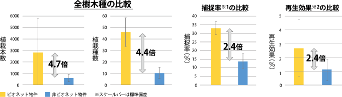 導入物件と非導入物件の比較検証によると、導入物件は非導入物件に比べ、植栽本数が4.7倍、植栽種類が4.4倍となっており、近隣にいない生き物を再生する増加率(ネイチャー・ポジティブ効果)が2.4倍高い。