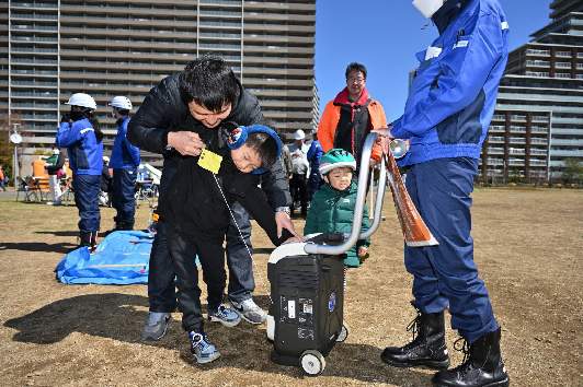 身体を動かしながら備品の使い方を身につける訓練。実際にマンションなどで備えている様々な防災備品が並んでいる中から、例えば「停電してしまい周辺は真っ暗。屋外の明かりを確保しよう」というミッションに対して、「発電機と投光器を選び出し、実際に備品を使ってみる」、という訓練を行いました。また、地域の顔見知りを増やすために参加者同士でチームを作り自己紹介をして交流を深めながら、地域で助け合うための防災備品の使い方を学びました。まずは自ら考え、そして防災備品の使い方を知り、更に実際に使用することで新たな備えに繋げます。