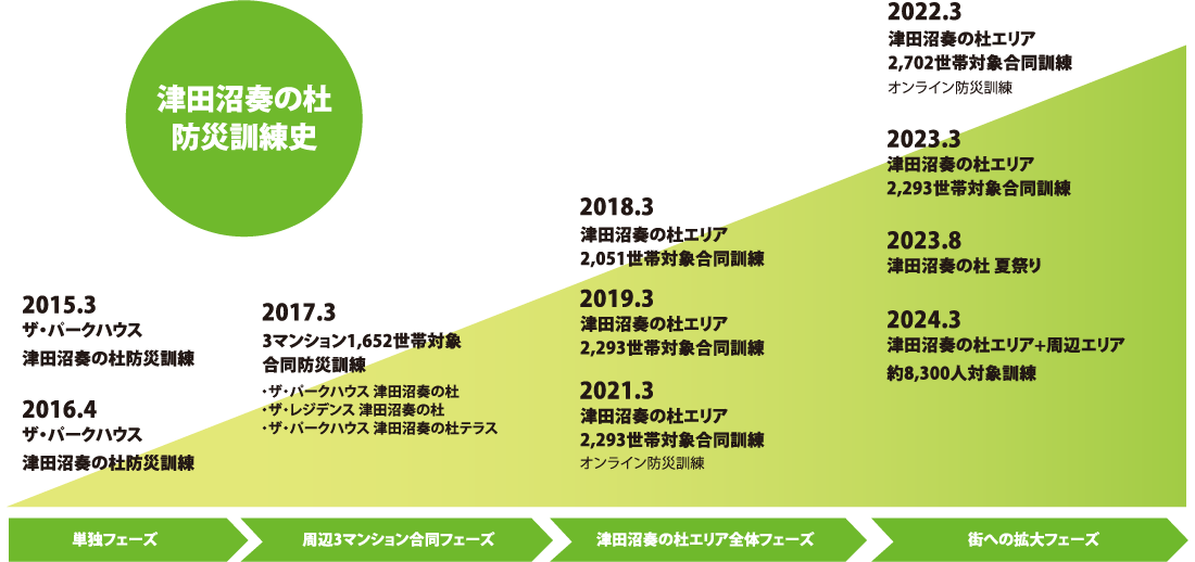 マンション内の住民同士の関係はもとより、津田沼奏の杜では毎年訓練を実施していく上で、様々なマンション、関係各所と打ち合わせを重ねることで、災害時に助け合える下地が作られているといえます。そうした関係性の構築が地域全体でのエリア防災力の強化につながっています。