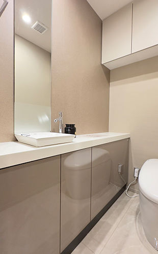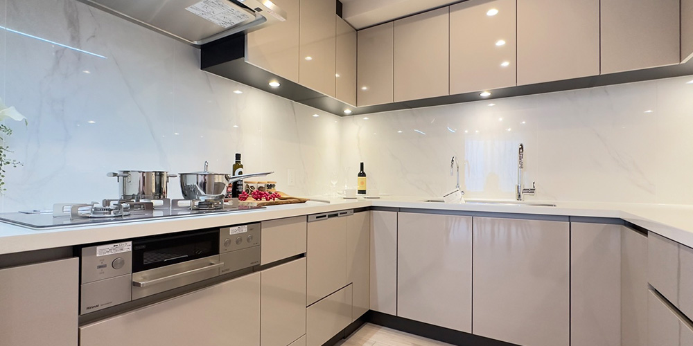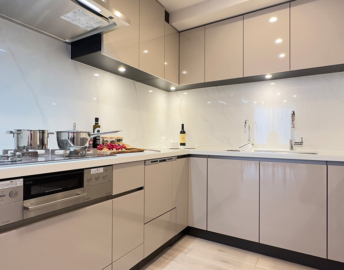 新たに設置した豊富な収納量を誇るコの字型システムキッチンは、ビルトイン浄水器、食器洗い乾燥機に加え、人造大理石仕様のキッチントップも含め、高級感のある仕様が魅力です。