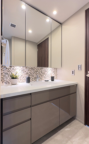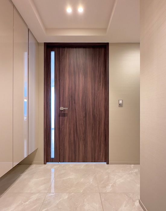 玄関・廊下・洗面室・トイレ床には600角の磁器質タイルを採用し、ホテルライクな空間に仕上げました。
