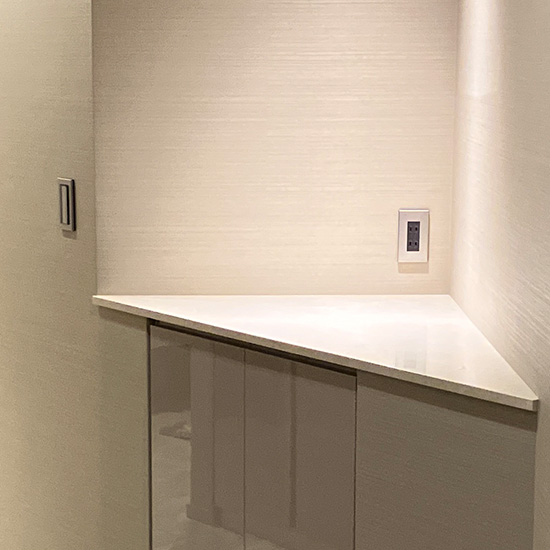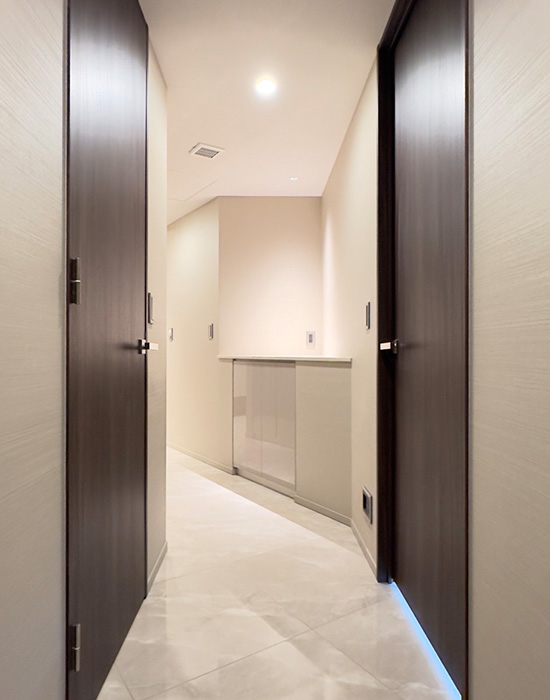 長い廊下にカウンター収納とピンスポット照明、コンセントを設け、入居後にお客様ご自身で飾り付けが出来るよう空間のアクセントを作りました。