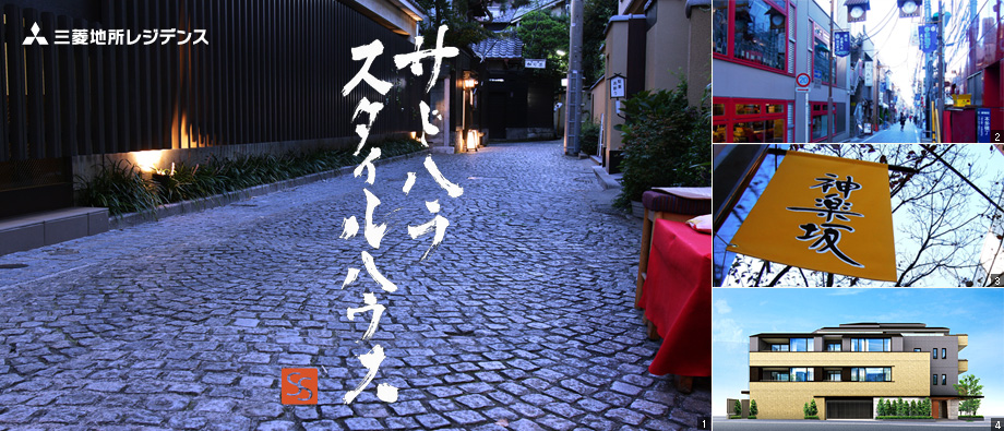 1.神楽坂周辺(現地より約880m・徒歩11分) 2.神楽坂周辺(現地より約910m・徒歩12分) 3.神楽坂周辺(現地より約760m・徒歩10分)平成24年1月撮影 4.外観完成予想CG