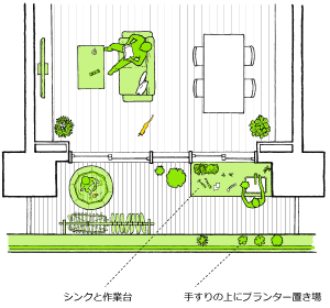 さらに植栽については、絵のように手すりの上にも植栽を置けるようにしてあるのはどうでしょう。最近ではゴーヤなどの緑のカーテンを育てるのもはやっていますが、ネットをどう美しく付けるかは悩むもの。バルコニーの天井の下にネットや木製の格子などをかけるフックもあらかじめつけておきたいと思います。