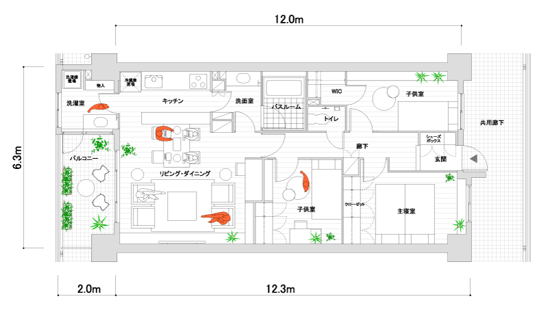 次の絵は洗濯室をバルコニー側に出してみました。洗濯室には専用の流しもつけてみました。こうすれば乾燥機を使う場合はこの部屋で、また外に干すのであればバルコニーにもすぐ出せます。外壁に面しているので、ガス乾燥機を使う場合の排気の問題も解消できます。また外には干したくない洗濯物もここなら外からもリビングからも目に触れず、安心して干す事もできるでしょう。天気の悪い日も心配ありません。
