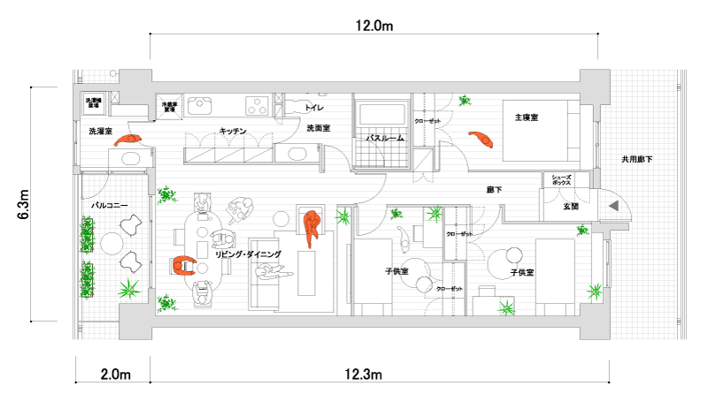 まずは下の絵ですが、バスルームからキッチンを抜けてバルコニーまで一直線の動線を確保してみました。洗面室の隣に洗濯機置き場を配置して、キッチン側からも使いやすく、また反対側にはカウンターを設けて、洗濯物をたたむなどちょっとした作業もできるデスクを置いています。