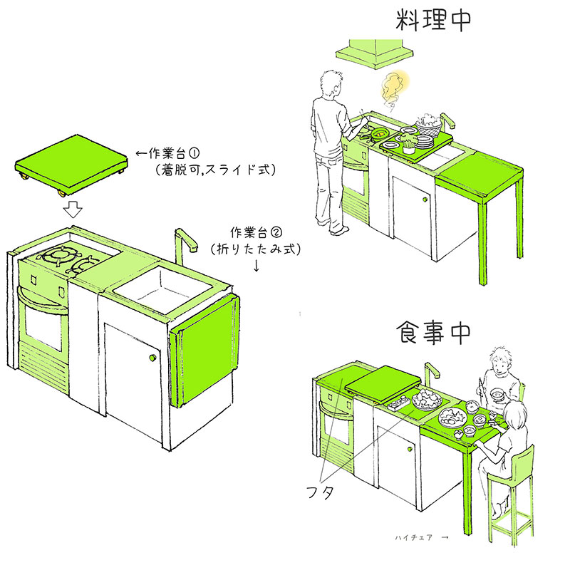 1 キッチンは小さなままで、作業台を組み込んで使うときに広げられる