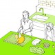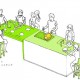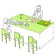 大きなテーブルの中にグリルとシンクを埋め込みます。作業は便利ですが、座っているひとの目の前にあるために、調理しながらすぐに片付けないと目障りです。これもキッチンとダイニングを同じ高さにすると高い座面の椅子を必要とします。