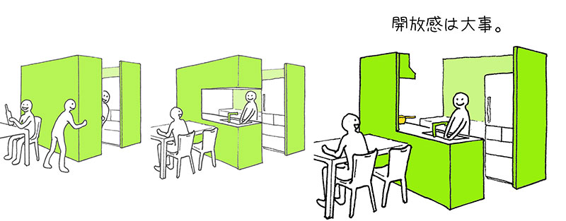 キッチン前のカウンターが少し高くなっていると盛りつけたお皿を置いたり、ちょっとしたものを置くのに便利です。また高くなったカウンターの下をくりぬいて、調味料などの置き場にするというのもいいかもしれません。中にはキッチンカウンターの上には何もものを置きたくないという人もいるでしょう。そうしたことも考えて、キッチンの上段にものを置けるカウンターを浮かしてつける案も考えてみました。