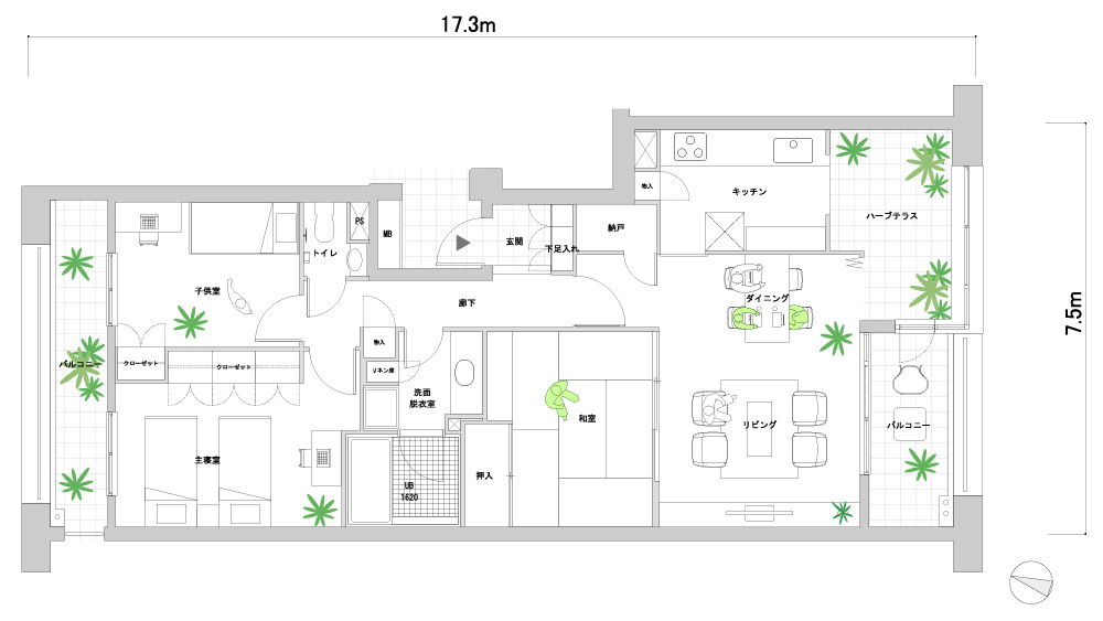 今回は海外赴任から帰国予定のご家族です。帰国に合わせて購入した築10年の中古マンションは決して古くはないのですが、間取りの刷新をしたいというご要望でした。バルコニー側に明るい書斎があるのが特徴です。また玄関を入ると南北両側にバルコニーが設けられたとても良いプランです。このような間取りの場合、玄関が暗くなりがちですが、今回はその解決案も提案しています。また広いリビングをどのように活かすか、キッチンとリビングの関係、既存の和室をどのように変更するかなどについても考えてみました。