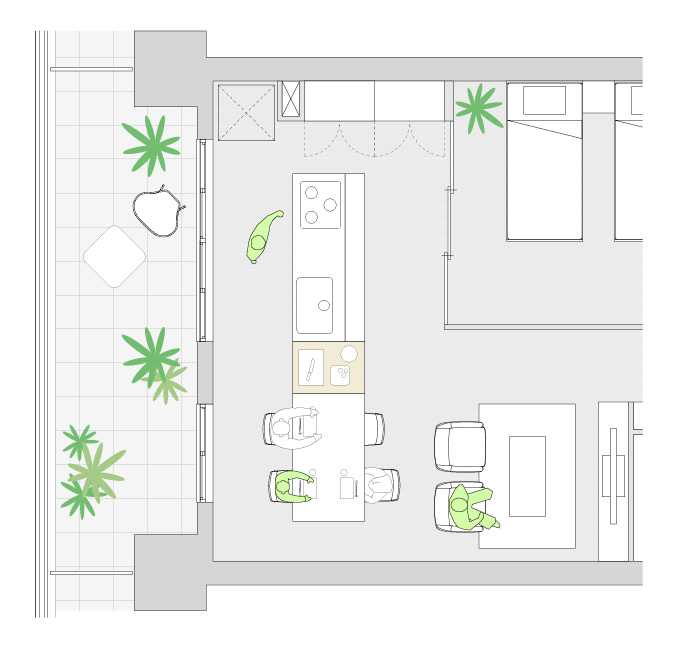 この案ではキッチンを壁付にし、横に調理スペースと収納をエクステンションしています。