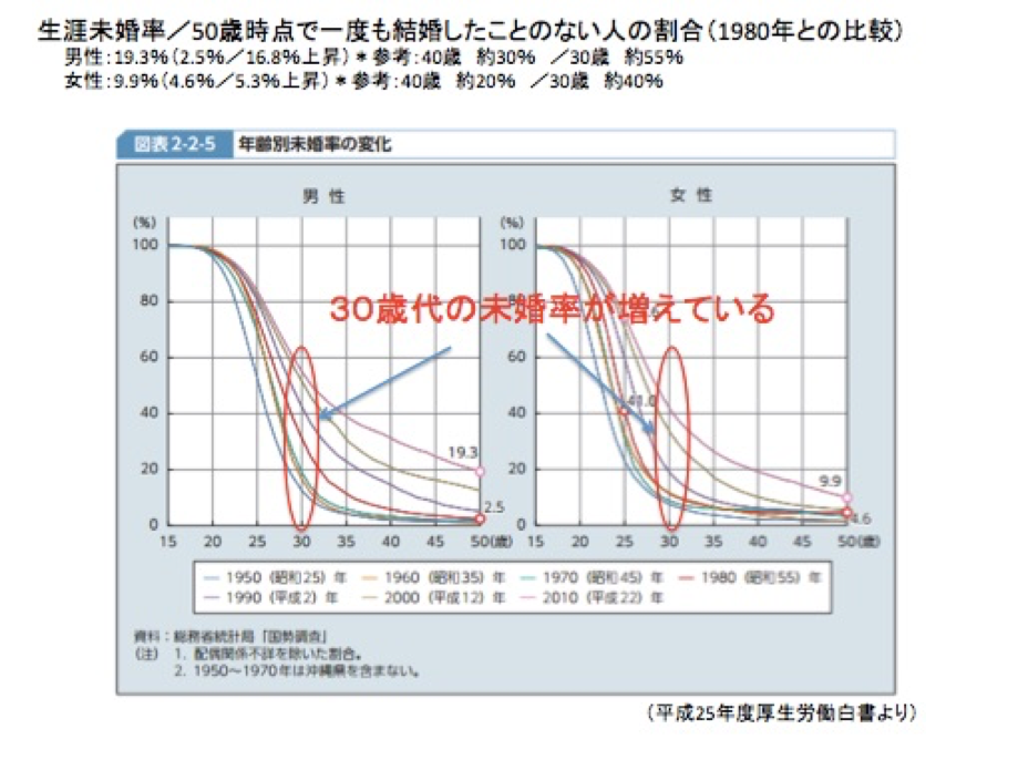 下のグラフをごらんください。この50年間の結婚年齢の推移です。このように結婚しない人がいかに多くなっているかがわかります。