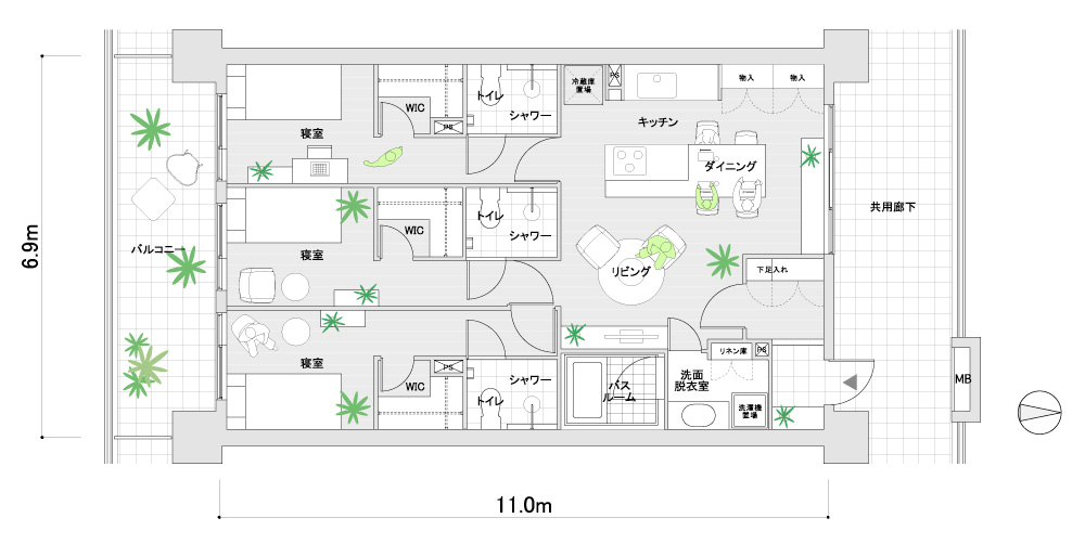 前回のコラムで「nLDKの行方」と題して、個室を充実させて、大人の家族が一緒に住むということ、そして夫婦も共働き、寝室も別室の案を書いたところ多くの方から反響をいただきました。そこで今回はもう一つ、それぞれの個室にトイレもシャワーもつけてみました。ここでの想定する暮らし像は夫婦は50代共働き、子供は独立しています。夫婦はそれぞれ一部屋づつ使い、一部屋は空いています。空いた部屋があれば親しい友人を気軽に招いて泊めることもできますし、長い時間滞在してもらってもお互いに気兼ねすることはありません。高齢になって夫婦どちらかが一人になっても、友人と一緒に住むとか、介護が必要になっても子供に来てもらうとか、他の誰かに来てもらうとかも気軽にできるでしょう。一見ビジネスホテルのようにも見えますが、共有スペース(奥の部屋)には大きなキッチンがあります。食事をするというのはコミュニケーションの大事な行為です。テレビを見たり、音楽を聴いたり、それぞれの部屋で自分の好きなように過ごします。家族が一緒の時、友達が来た時などはみんなで食事をしながらコミュニケーションをはかるのです。共有部分にトイレを置いていないのは、それぞれの個室のトイレを来客者は使うように考えました。