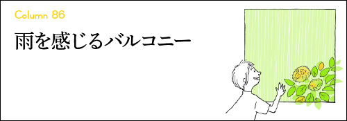 さて雨を深く認識するためには、雨が何かに当たっていることを理解できることが必要です。昔のように、庭があれば手水鉢にたまった水に波紋ができたり、石や苔が濡れてきたり、砂利に雨が跳ね返ったりと、そこに何かしらの動きを見ることができるのです。最近のマンションでは、雨はバルコニーの手摺側に降っているので、部屋の中だと雨が降っているかどうかも気づかないこともあります。そこで雨が降っているのを気づくためには、せめて、バルコニーの手摺側に植栽、花、すだれなど、雨音を感じられるようなものを置くのはどうでしょうか。バルコニーに「かめ」をおいてあえて上から流れる雨どいの雨水を流してみるというのもよいかもしれません。いずれも建築の納まりを考えると、バルコニーに雨がいつも流れるのはあまり好ましくはないのですが、ここは風景を優先してみてはどうでしょうか。そしてもうひとつ、バルコニーのない窓も重要です。バルコニーがなければ、雨が直接窓にかかりますし、水滴が流れていく状況も見えます。雨の日に窓辺に寄り添い、窓の外を眺めたり、外の風景をみるのも悪くないでしょう。とはいえこれも雨仕舞いから考えると建築的には本当はよくありません。小さくても少しだけ雨よけの庇はあったほうがいいかもしれません。