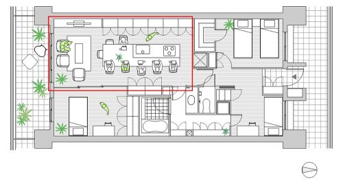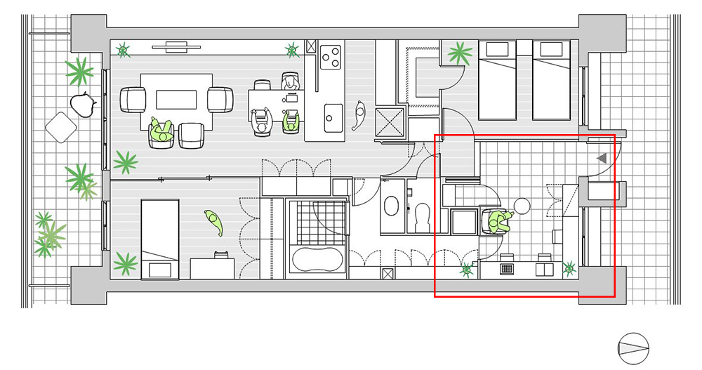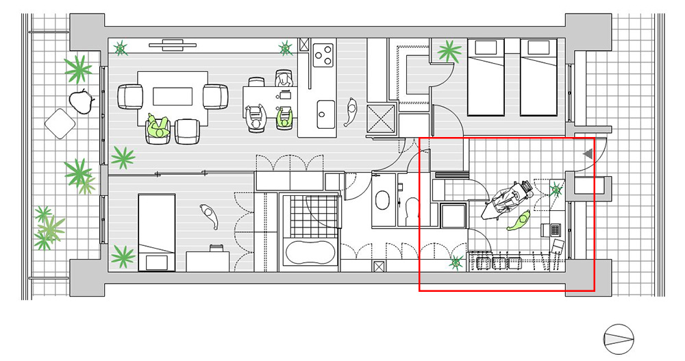 スモールスペースだとしても、プライベートとパブリックを分けられたらいいですね。この図では、玄関ドアを開けたらすぐにワークスペースが広がります。仕事関係の人を自宅に招いてミーティングをすることもできそうです。