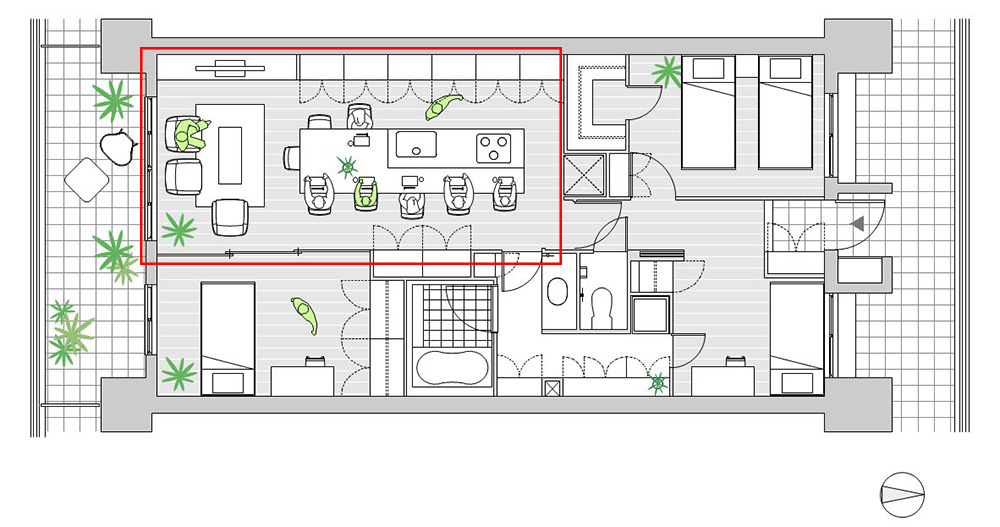 フリーアドレスのオフィスやコワーキングスペース、おしゃれなカフェのように、ひとつの大テーブルを囲んで家族それぞれが仕事や勉強をするのはどうでしょうか。この絵ではLDKの中心にオープンキッチン、カウンター、ダイニングテーブルが一体となった大型家具を造作してみました。このように大きなテーブルやカウンターがあると、資料やテキストをたくさん広げられるのもメリットですね。