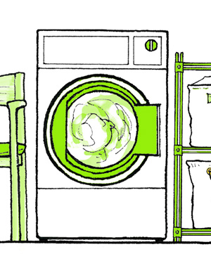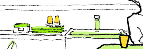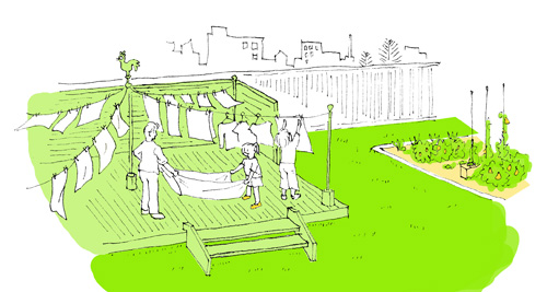 エレベータ脇の空間を利用してみました。共有の洗濯乾燥機と言っても、一階や地下まで降りていくのはおっくうなもの。この絵のようにフロアごとに1〜2台、最小限置くというのはどうでしょうか。普段は扉を閉めておきますが、使う時には扉を開いて使います。エレベータの近くという事で、待っている間にご近所の方とのコミュニケーションもおきやすいかもしれません。