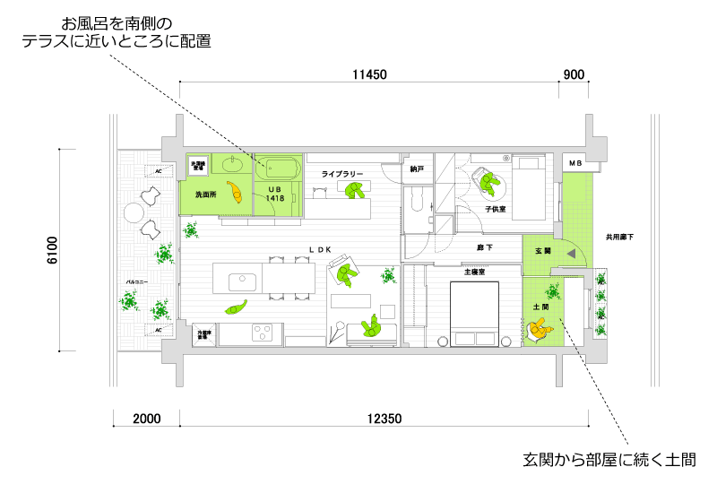 これ以外にも、管理面でも今までこのコラムで取り上げてきたことをいくつか実現させています。玄関前にはアルコーブがあり、そこには子ども用自転車やベビーカーなども置けたりします。アルコーブの天井についているフックには生活用品を掛けたりすることもできます。また、共用部分の中庭では飲食ができたり、屋上テラスを開放するなど、住人同士、友人などを交えての居心地のいい共用空間を考えてみました。中庭で、前回のコラムで紹介した住人祭など、住人同士のイベントもできそうです。