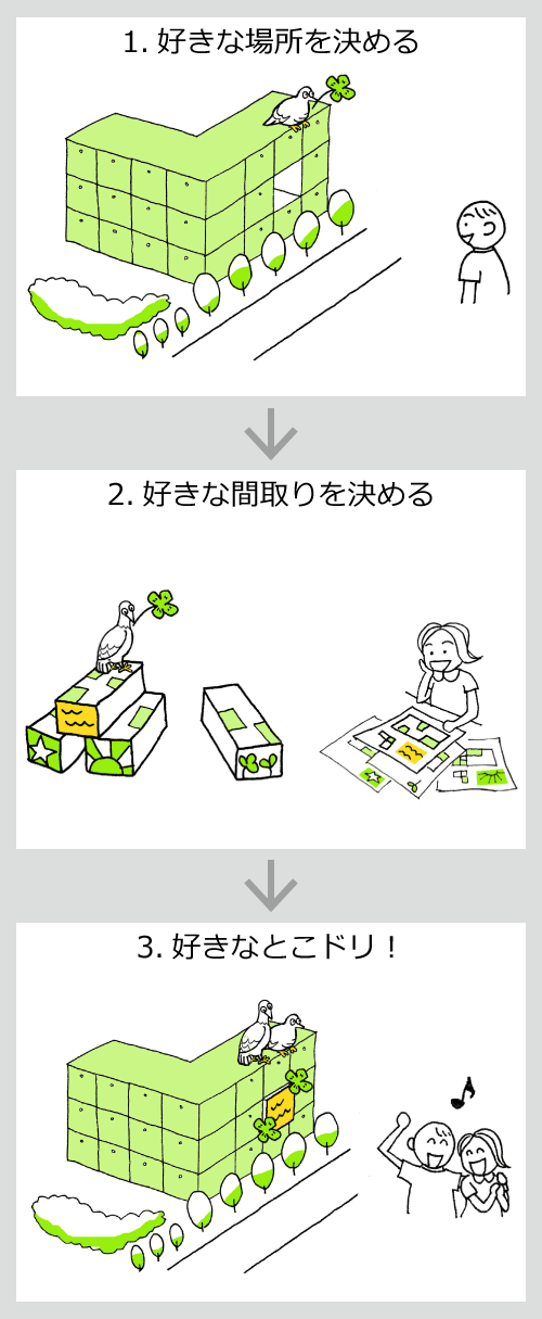 これまでのマンションは、上下階の水廻りが同じ位置でなければならなかったため、間取りの自由度が少ないものでした。このマンションは床下に十分な配管スペースが確保されていて、水廻りの位置まで自由に変えられるようになりました。通常は、気に入った住戸が、気に入った間取りでないことがよくあります。これまでのマンション購入は、場所と間取りのどちらかを優先させなければならなかったのです。しかしこのマンションは、自分の欲しい場所を価格と比較して選ぶことで、あとはあらかじめ用意されている豊富なメニュープランから、好きな間取りを選ぶ事ができます。また用意されている間取りも、今までのような一般的な間取りにこだわる事なく、思い切ったプランを現実のものとすることが可能なので、大胆な間取りも用意する事ができました。こうした仕組みを私たちは「スマート スタイル セレクト」と名付けました。