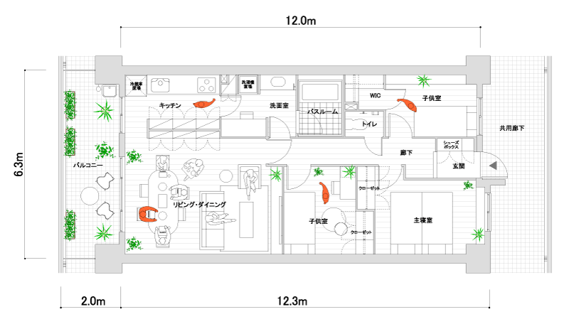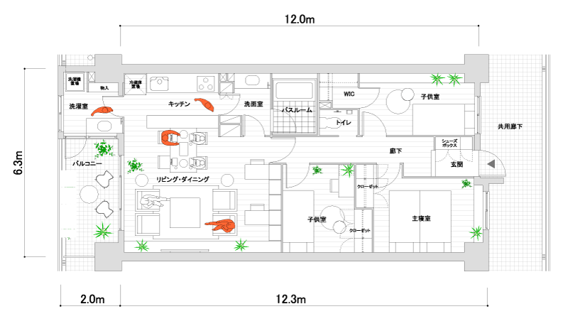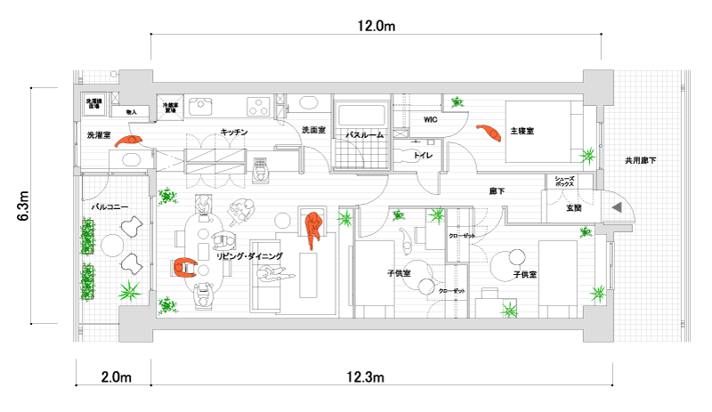 まずは下の絵ですが、バスルームからキッチンを抜けてバルコニーまで一直線の動線を確保してみました。洗面室の隣に洗濯機置き場を配置して、キッチン側からも使いやすく、また反対側にはカウンターを設けて、洗濯物をたたむなどちょっとした作業もできるデスクを置いています。