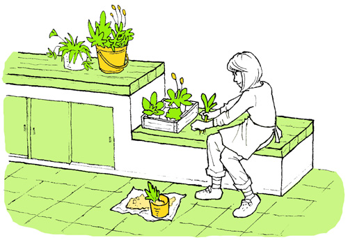 花台はちょっとしたベンチにもなって、そこでブーツを履いたり鍵をバッグから出す際に荷物を置いたりと便利なうえ、垣根の代わりにもなって、外との境界線を適度に保ってくれます。