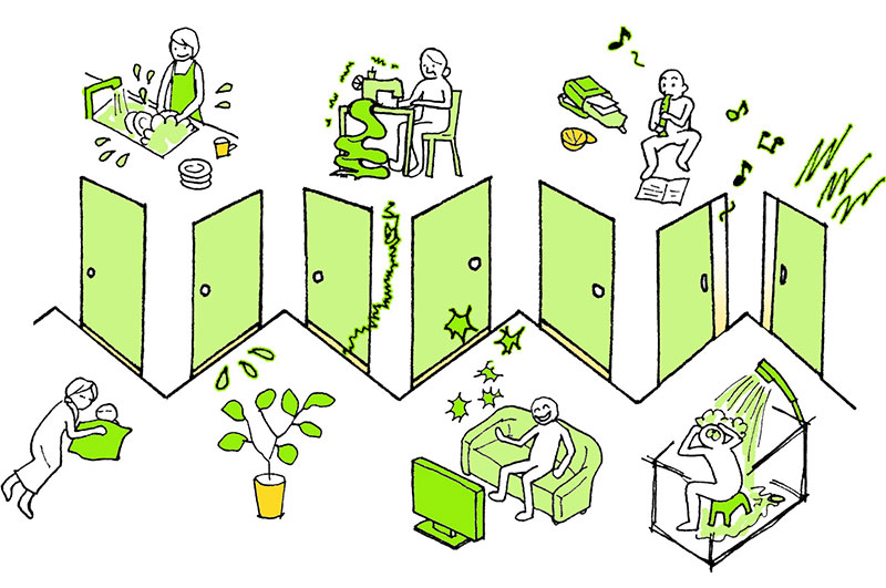 もちろん海外の住居のように、個室の防音はしっかりととりたいとう人もいるでしょう。その場合は開き戸にしてドアの下はカットせずに、換気は別のルートを通す工夫にすれば可能です。廊下の天井などから遮音換気につないでおくという方法や、扉の中に換気口を組み込んで、空気の通り道を屈曲させて吸音させる方法もあります。