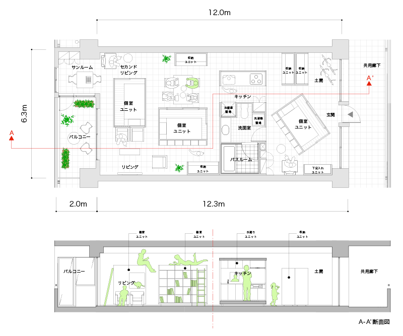 今回の提案は、部屋を大きな家具のように考えてみたのです。このユニットには空間の内側だけでなく外側もある事が大きな特徴です。壁には窓を開けたり、外側からも本棚を付けたりもできます。少しあきたら壁も好きな色にペンキを塗り替えたり、レンガを積んでみたりとそのしつらえも自由に替える事も容易でしょう。