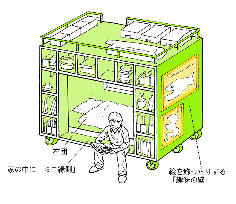 こうしたユニットにすると、暮らし方が変わったり、気分がかわったりしたら、そのまま家の中を移動したり、引っ越しする時も解体して、次の場所でまた組み立てるというのはどうでしょうか。