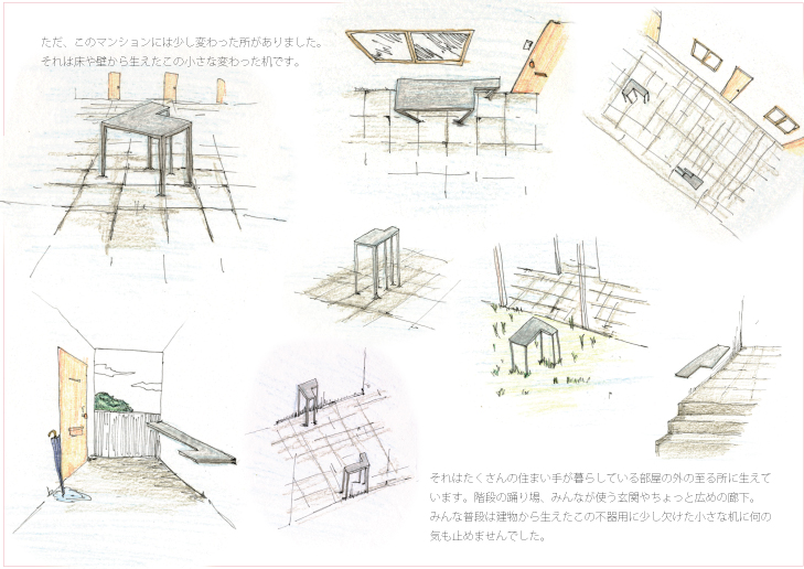 しかし誰もこのマンションにこんな風景を生み出すきっかけを作ったのが、この小さくもささやかに生えたこの机とは知りません。大事なのは机がきっかけとみなが知ることではなく、机によって生まれた部屋を飛び出した豊かな生活の方なのです。