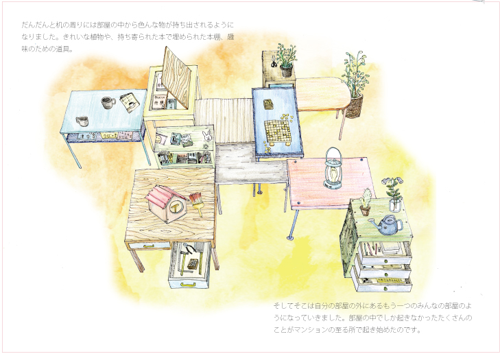 そしてそこは自分の部屋の外にあるもう一つのみんなの部屋のようになっていきました。部屋の中でしか起きなかったたくさんのことがマンションの至る所で起き始めたのです。