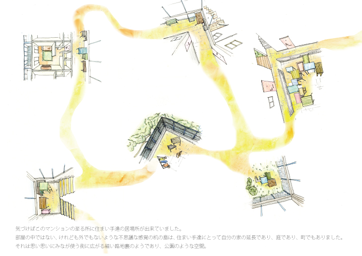 マンションに住まうということは自分の部屋に住まう事ではなく、みんなで同じ場所を感じ合いながら暮らし合うことだと気づかせてくれました。一人では生まれなかった、みんなだから生まれた豊かな風景。