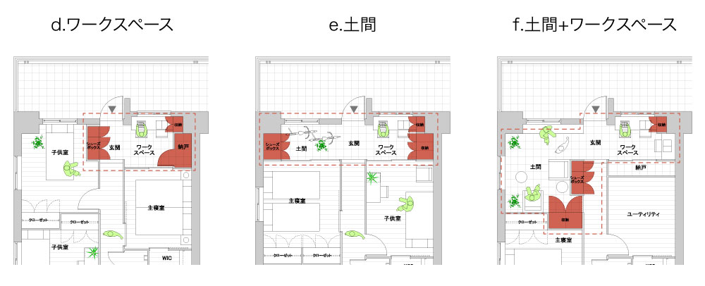 cは、廊下の一部に収納をつけました。靴だけでなく様々なものを納めることができるようになっています。持ち物の数や種類にあわせて、玄関近くに収納をし、自分の部屋まで物を持ち込まないで暮らすという方法です。廊下を単に通路としてだけでなく、大きな壁面収納としてみました。