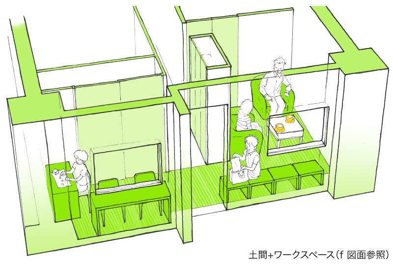 fは小さなリビングをつくってみました。来客などのスペースとしてここだけはいつもきれいに保っておけば不意のお客さまにも安心です。家の中にはもうひとつ家族でくつろぐリビングを置けば、その場所は少し散らかっていても気になりません。もちろんお客さまだけでなく、仕事の話や仲間とのコミュニケーションをする場として活用してもいいでしょう。