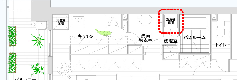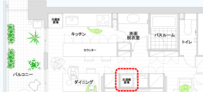 ① 洗面とキッチンとの間に洗濯機置き場を配置、キッチンにつながる2ウェイの入口を設けてみました。洗濯もキッチンで料理する合間にできると便利でしょう。
