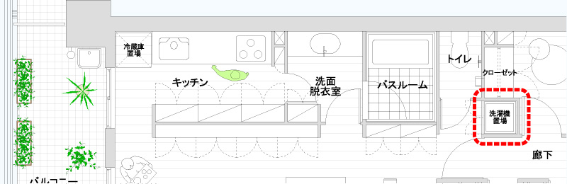③洗濯機を廊下に配置してみました。全自動の洗濯機はキッチンやお風呂とは独立しておいてもいいかもしれません。