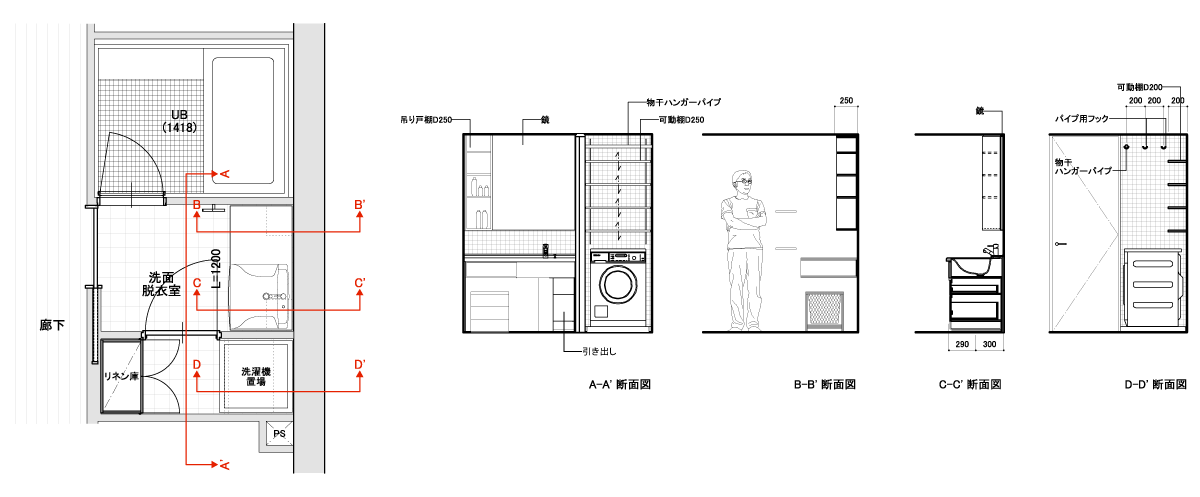 そして床に近い部分の収納は使いにくいものです。特に洗面化粧台の下には排水の管があるため、引き出し式の収納が作りづらく、実際の使い方を確認してみると多くの方が中途半端な使い方になっているようです。それならばいっその事、引き出しは使い易い部分一部を残してあとはオープンな空間にし、床を広げてみるのはどうでしょうか。その際に配管の処理も考える必要があります。見せてもかっこいいものにするとか、床に取り付けるのでなく壁につけるという方法もあるでしょう。こうして空きをつくることで、空間に広がりもできますし、もちろんあとから好きな収納家具を置くこともできます。