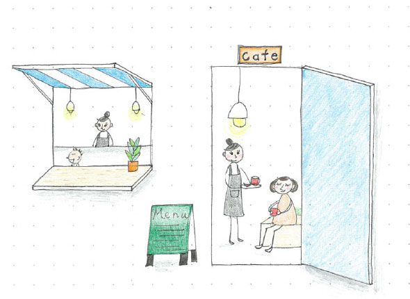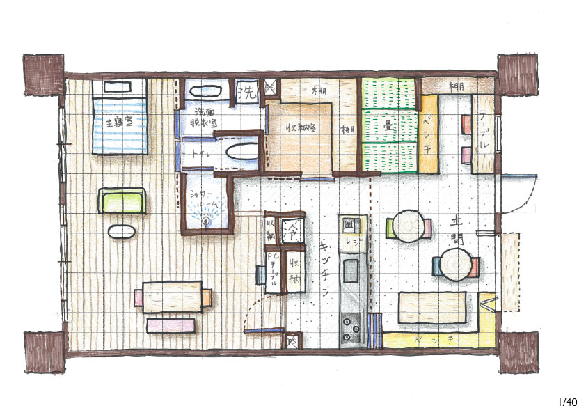 玄関からすぐの土間部分を皆、店舗や事務所にしている。キッチンも玄関近くにあるからカフェやバーにも対応可能。見せたくなければ引き戸で隠すことができる。和室は飲食店なら小上がりとしても使えるし、プライベートでお茶の間として使うこともできる。様々に仕切りすることができるのでどこまでお店として使うかはその人次第。