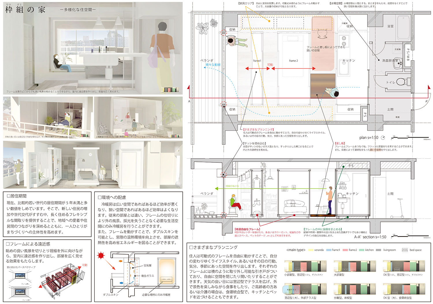 少子高齢化(人口減少)や経済成長の低下による需要の飽和で、空き家の数は増加していく傾向にあります。科学技術の進歩、国際化、世代交代での家族のあり方などライフスタイルの多様化が見られ、定住期間が短く地域の社会性が失われています。住人自身が手を加えることのできるフレームを自由に作りかえ、動かすことで自分のライフスタイルの変化にあわせて空間を生み出します。フレキシブルで長く住み続けたい間取りを提供することにより地域への愛着や住民主体の催しもので住民間のつながりを深めるとともに、1人ひとりがまちづくりへの主体性を高めます。