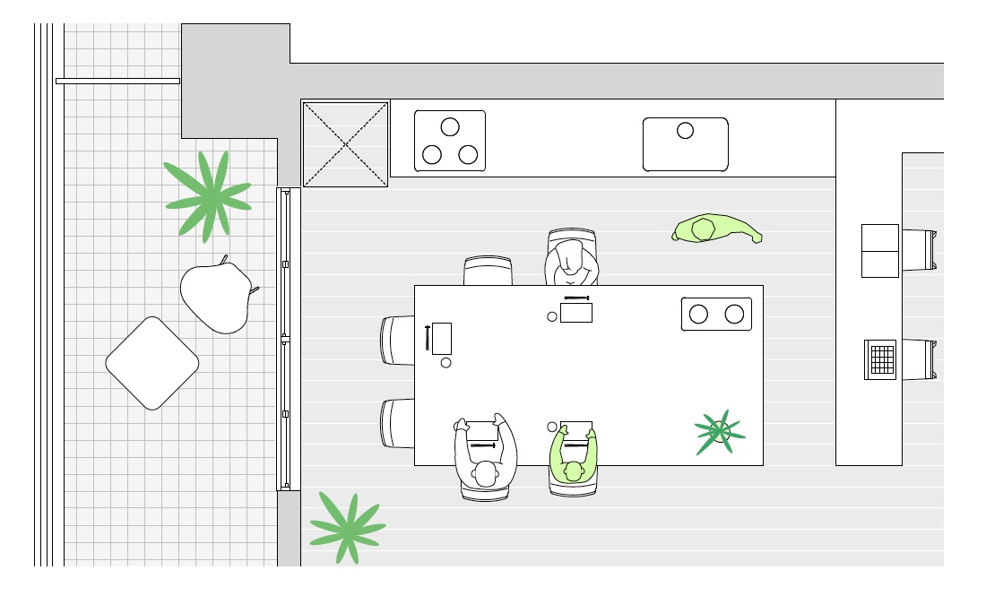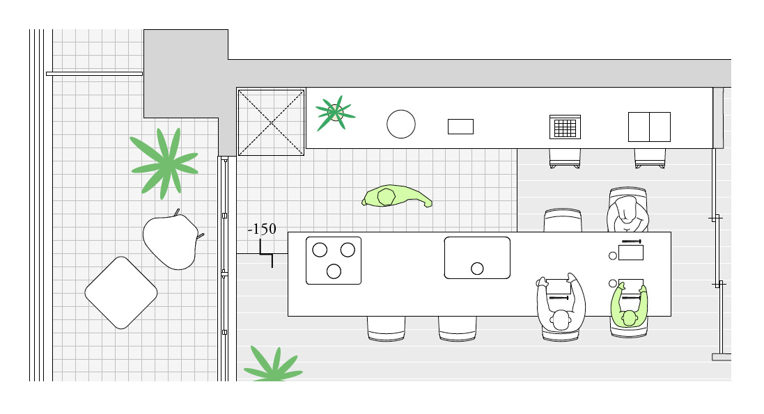 今回は、その中でもキッチンやダイニングを直してみてはどうかという話をします。60歳を超えると、仕事を持っていても現役時代のような働き方とは違い、時間のゆとりもうまれることでしょう。家で過ごす時間はパートナーと一緒にいる時間が自然と多くなります。二人で何か共通の趣味を持つのも良いですが、まずは毎日の食事を一緒に楽しんでみるのはいかがでしょうか。おいしいものを食べる、おいしいものを作る。そんな時間を共有するのは良さそうです。作る人、食べる人というそれまでの食事のスタイルを変えて、パートナーと一緒に料理を作りながら食べたり飲んだりするのです。そうなるとキッチンとダイニングの形も変わりそうです。例えば下の絵のように、ダイニングテーブルにレンジが組み込まれていて料理をしながら食べます。大きなテーブルがあれば、話しながら一緒に下ごしらえをするのもいいでしょう。