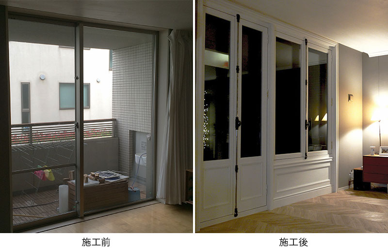 ただ、日本では窓まわりは通常アルミサッシでできており、付け替えるのはかなり大変です。そこで、既存のサッシはそのままにして、その内側にもうひとつ気にいった内窓をつくるというのはどうでしょうか。下の写真のように窓を変えると空間のイメージは大きく変わります。さらに断熱効果も飛躍的に上がるという効果もあります。