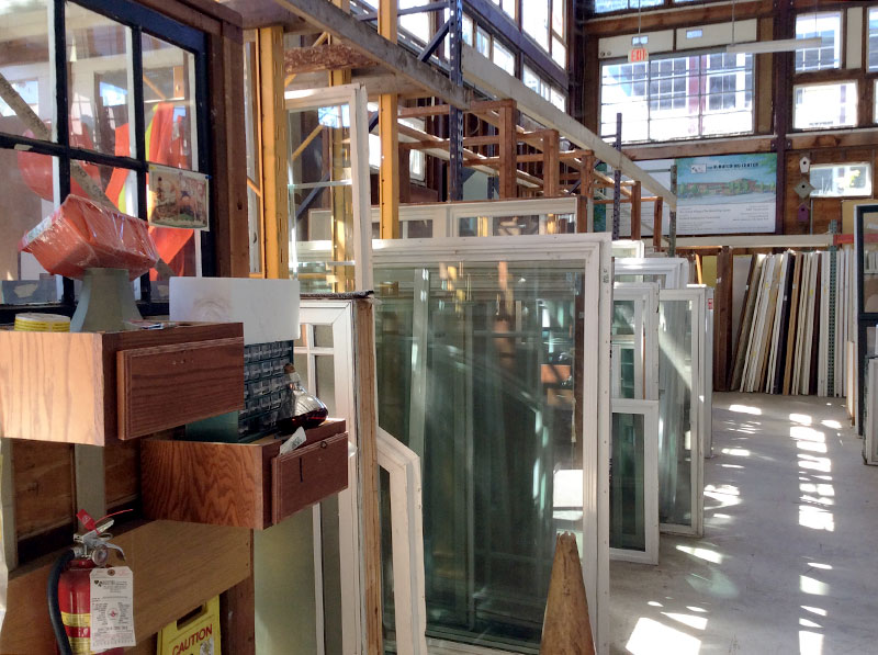 今回は窓について書いてみようと思います。この写真はポートランドのThe ReBuilding Centerというお店の窓です。小さな窓の組み合わせで大きな窓をつくっているのです。そしてもう一枚はこのお店の中の窓のコーナーです。ここにある窓はすべて廃材です。ここは、家を直すとき、壊したとき、使えそうなものを持ってきて、格安で売り買いできるリサイクルショップなのです。ドア、窓、トイレ、シャワー、コンロ、照明、取手、柱や梁、タイルなど家の住宅部材のありとあらゆる廃材がここにはあります。さらに、大工道具が揃えられていて、部材を裁断したり、加工したりすることもできます。