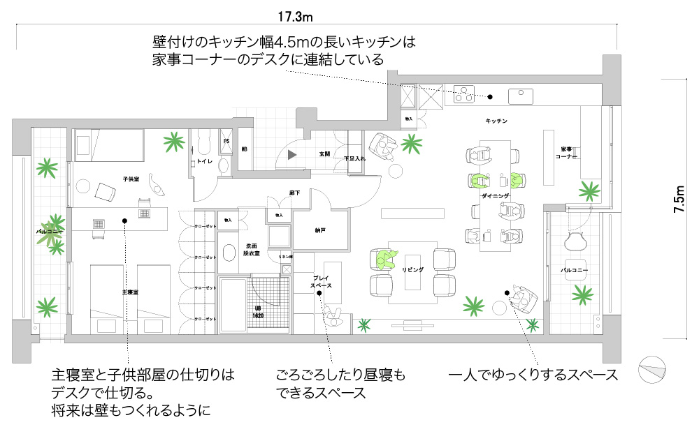 寝室の壁、和室の壁、書斎の壁など水周り以外のすべての壁を取り払い、大きな一室空間にしてみました。家族がどこにいても気配を感じ、家の広さを楽しみながらも様々なコーナーにそれぞれが居心地の良い空間を発見できるように考えました。キッチンはあえて既存の向きである壁側に向いた配置を残し、家族のみんなが料理に参加できるように、また友人など尋ねてきた人も料理や片付けに加われるようにしました。キッチンの背後には配膳台を兼ねた料理の準備スペースをつくり、ダイニングテーブルに連続させた大きな作業台をつくりました。ベランダ側にあるサンルームは明るい家事コーナーにしています。奥様だけでなく、ご主人やお子さんの勉強スペースとしても活用できるでしょう。もちろん大きなダイニングテーブルも食事以外の時間はワークスペースとしても活用できるでしょう。大きなリビングには、ごろごろできるようなベンチ式のコーナーを設けたり、ラウンジチェアに一人でゆっくりとくつろげるようなコーナーをつくりました。こうしたコーナーをつくることでメインのリビングソファ周りはいつも綺麗に整った空間として保ちやすくもなるでしょう。お風呂の位置は同じですが、洗面脱衣室の位置を少し変えてみました。収納が少なめですが、あまり多くのものを持たない、見える収納を提案してみました。