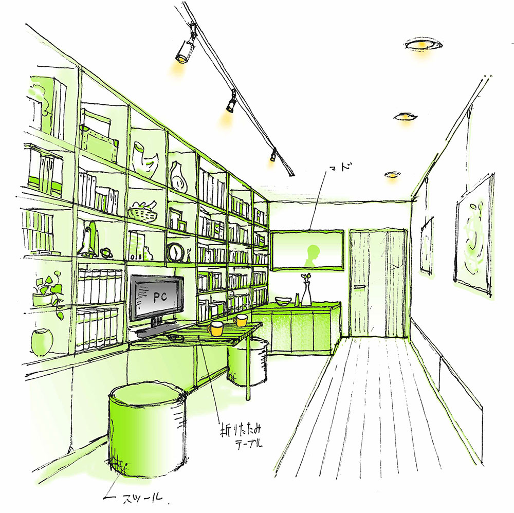さらに、既存の玄関の壁を取り払い壁一面に本や小物を収納。土間には折りたたみテーブルとスツールを置いて、多目的なライブラリーとして活用できるようにしました。