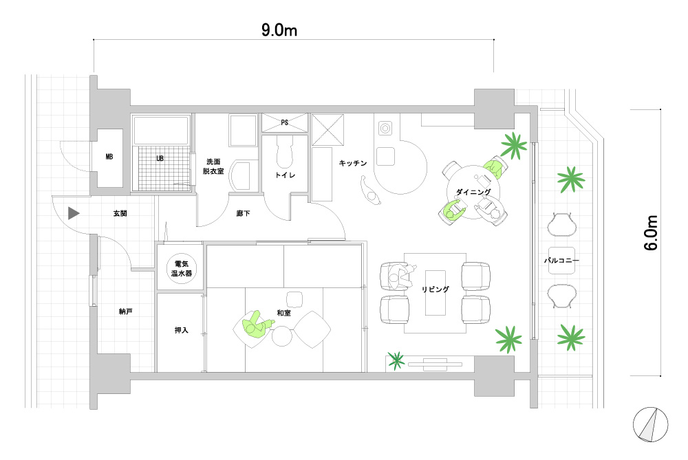 一人で行くという想定はどうでしょうか。毎日のハードワーク、週末は仕事をはなれてゆっくりとした時間を過ごすためのプランです。これからのことややりたかった勉強など、いつもと違う環境で他のことに取り組むのはどうでしょうか。趣味のサーフィンや釣りをするのもいいでしょう。たまには奥様や友人を招くのもよいでしょう。この提案ではワークデスクや書類棚もおいていますが、大きなダイニングテーブルでも料理を楽しんだり仕事もしたり、たまには友人と語らったりもできるでしょう。このマンションには温泉があるとのことなので、バスタブをやめてシャワーだけにしてみました。水周りがコンパクトになった分、その他のスペースを広くしてみました。