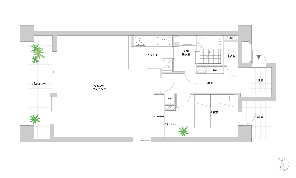 主寝室は4枚引戸を開放することでリビングと一体の空間になり、狭さを感じさせない工夫をしています。また、キッチンのカウンターをなくしたことで、洗面室からキッチンを通ってバルコニーへ一直線につながるようになり、家事動線が楽になりました。