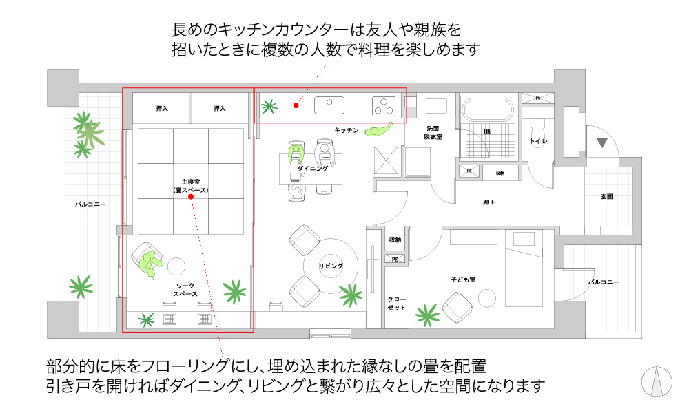 今まで主寝室だった玄関側の個室を落ち着く子ども室にして、バルコニー側に主寝室を作りました。主寝室の床は部分的にフローリングにして埋め込まれた縁なし畳にし、布団で就寝します。昼間は4枚の引戸が開け放たれて、家族で使える畳スペースとワークスペースとして広々と使います。キッチンは少し長めのカウンターにし、複数の人数が料理を楽しめます。友人や親族を招いて、一緒に料理や食事を楽しんでみてはいかがでしょうか。寝室を畳にし、リビング、ダイニングと一体に使うことで広々とした空間が生まれました。