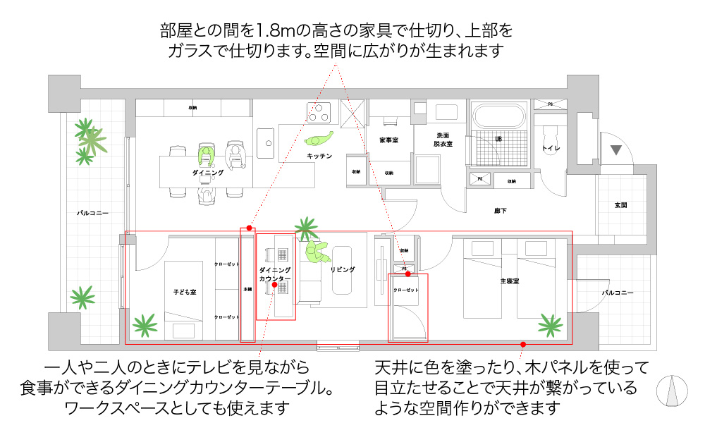 子ども室とリビングの間、主寝室とリビングの間は1.8mの高さの家具で仕切り、それより上の部分は空間の広がりを感じさせるためにガラスで仕切っています。天井に色を塗ったり、木パネルなどをつかって目立たせることでより空間の広がりが際立っていくでしょう。