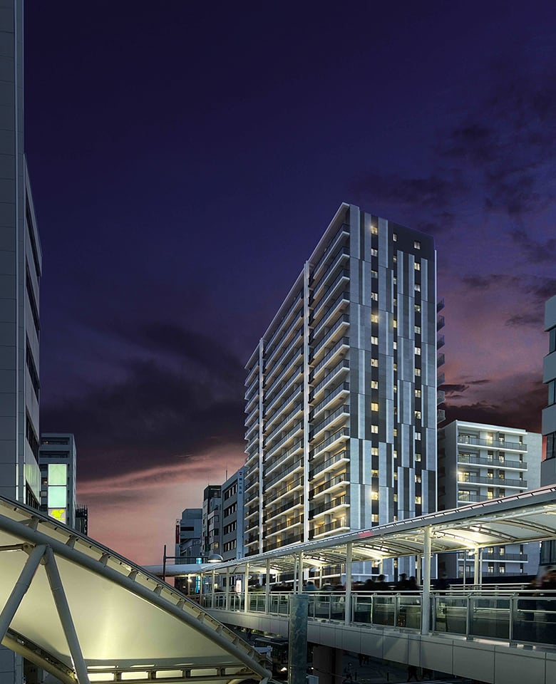 外観完成予想CG(ペデストリアンデッキより現地を望む)