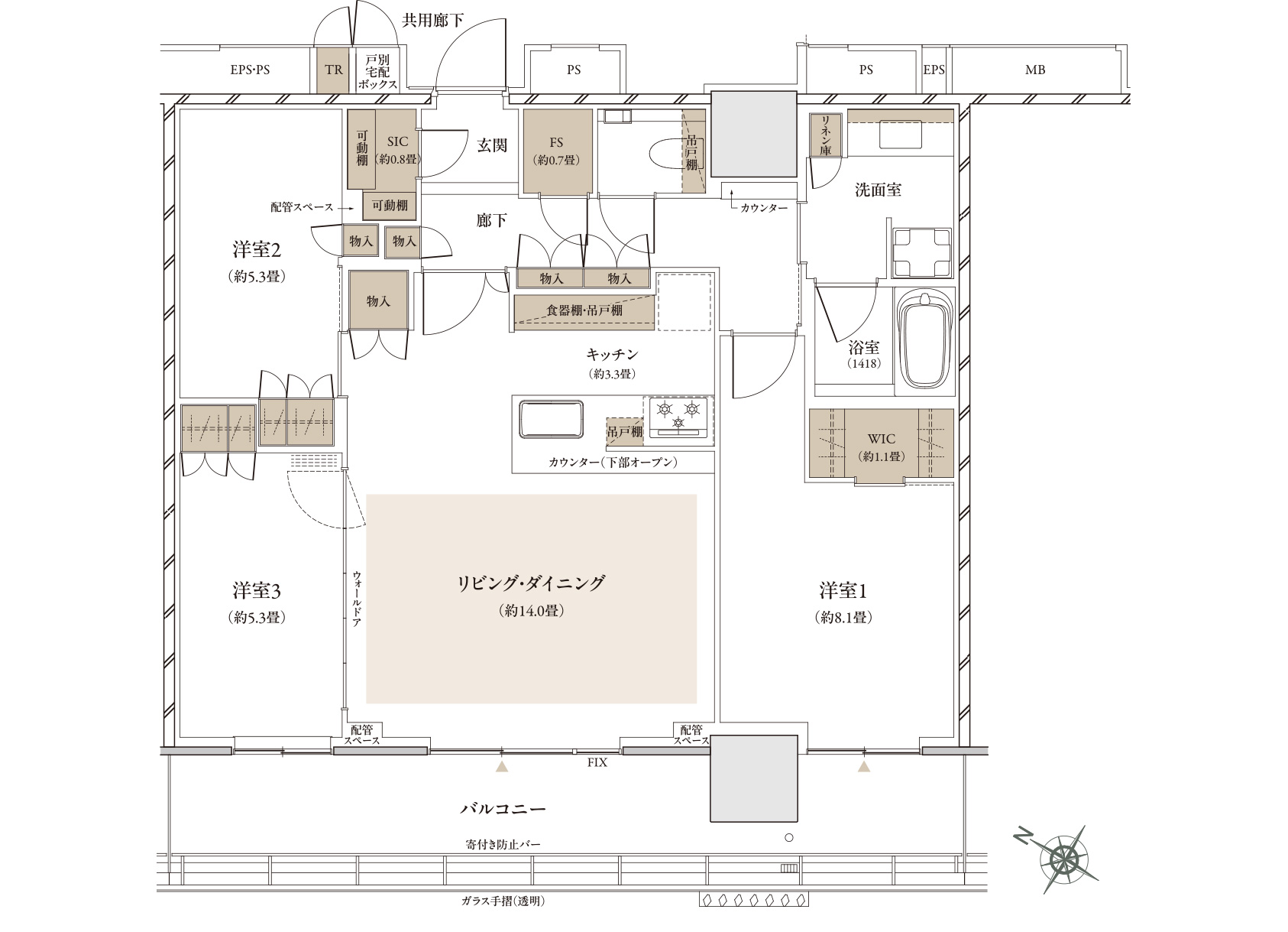 WIC:ウォークインクローゼット SIC:シューズインクローゼット FS:フリーストレージ TR:トランクルーム