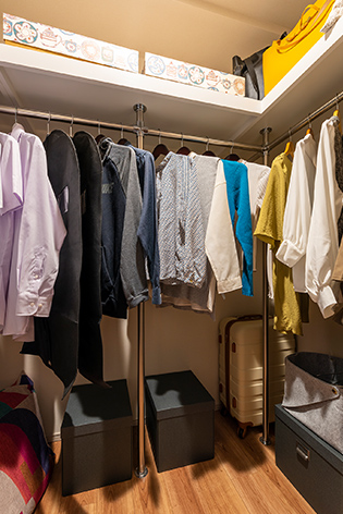 洋服を機能的に収納できるハンガーパイプのほか、帽子やバッグを置ける枕棚も設置しました。大きめのスーツケースや布団類なども余裕で置けます。
